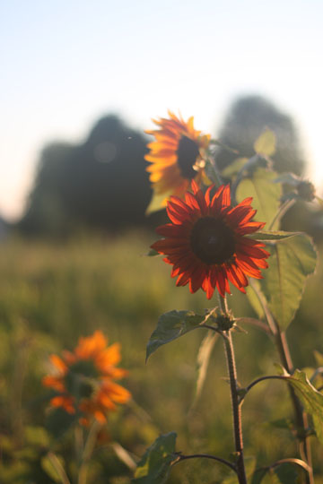 evening sunflowersThere’s a part of the field grown up in weeds that I’ve been telling people is being left fallow accidentally on purpose. I grew vegetables on it last year, and this year I intended to plant it in clover and leave it be. But when the cold spring delayed my primary tillage, that area was the only part of the field I could work, so I changed my plans and started planting there. Then, in June, with all the rain, that section turned out to be too wet to cultivate, and the weeds took over much of it. So I changed plans again and intended to plow it all under in the summer once the few crops planted there were harvested.